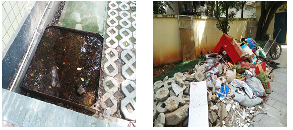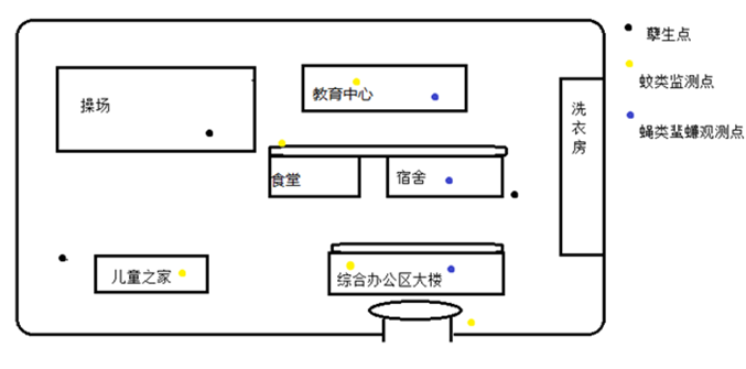 福利院内卫生环境条件良好,但是部分区域存在露天堆放垃圾情况,如儿童之家左侧,此处发现有蚊、蝇及鼠,且垃圾堆周围存在大量的白色泡沫塑料箱子,由于连续降雨,箱子中盛满积水,引起蚊幼孳生;与食堂相连的宿舍楼右侧,存在未加盖的垃圾箱,里面装有的剩菜剩饭容易导致蝇、鼠等数量的增加;教育中心左侧的公园内,在跷跷板的下面发现用来减震的轮胎,轮胎内部有积水,容易引起蚊幼孳生;我们还观察到福利院内的井盖孔隙太大,部分水沟未加盖等。在建筑物内部总体卫生环境良好,但在靠近厕所区域的房间内及窗户常开的房间内发现有苍蝇、蚊子等卫生害虫。