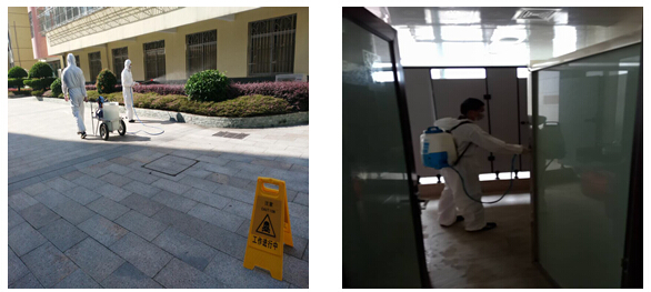 本次施工主要针对蝇类、蚊类和蜚蠊,分室内和室外进行重点区域滞留喷洒。室外使用手推式大功率机动喷雾器,使用顺式氯氰菊酯悬浮剂200倍液,针对露天垃圾堆、绿化带、以及井盖孔隙过大的下水道进行重点消杀,在喷洒的同时寻找并清除四周积水容器。室内使用背负式电动喷雾器,主要针对食堂、厕所以及办公室。